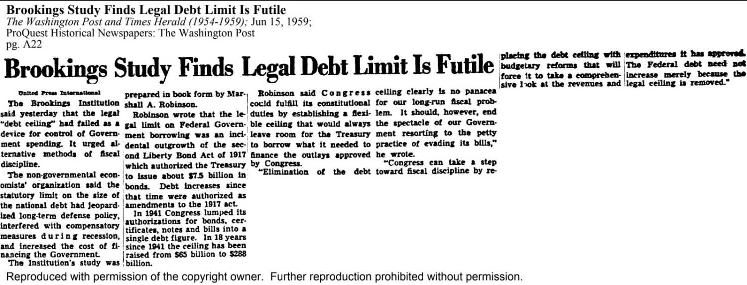 1959: Brookings’ Marshall Robinson publishes “The National Debt Ceiling: An Experiment in Fiscal Policy,” which argues that the debt ceiling had not only failed but backfired. Robinson wrote, “Elimination of the debt ceiling…[would] end the spectacle of our Government resorting to the petty practice of evading its bills.” The study is cited in policy debates about the debt ceiling during the 1960s and onward, including as recently as 2023.