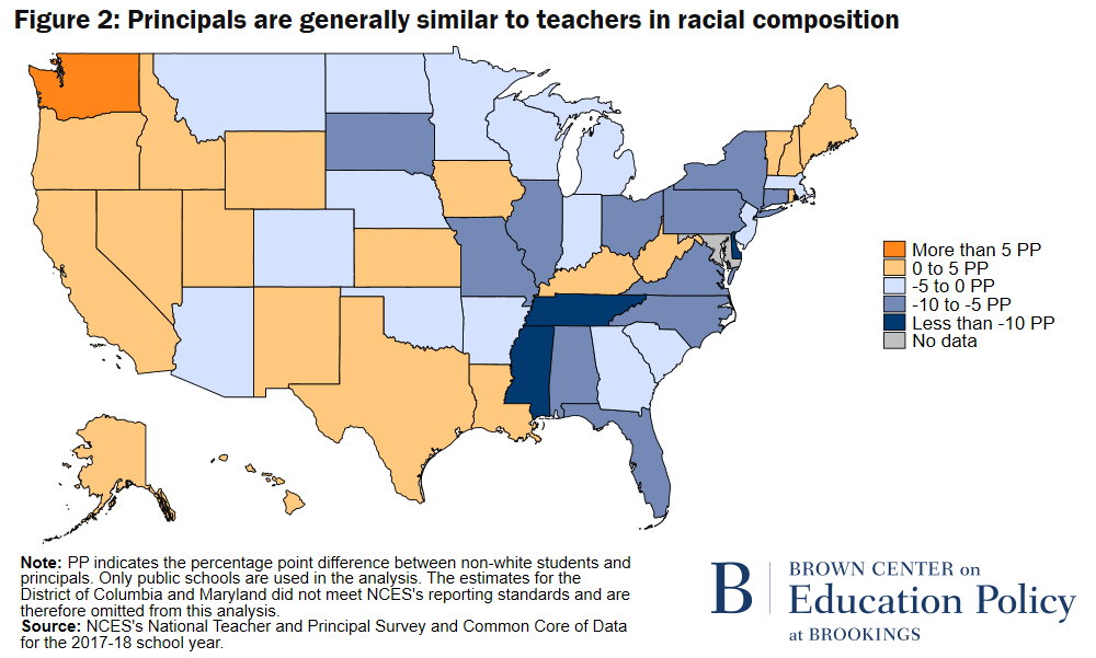 Since the principal pipeline relies heavily on the teacher workforce, it’s also useful to compare racial representation between principals and teachers. Figure 2 illustrates principal-to-teacher diversity gaps in the U.S. by state as measured by the percentage-point difference between the share of non-white teachers and non-white principals. A positive (negative) diversity gap, represented in shades of orange (blue), means that principals are less (more) racially representative than teachers.