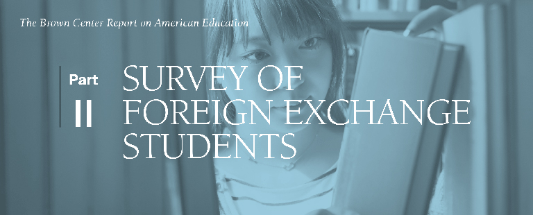 In the spring of 2001, we conducted a survey of students from abroad who were nearing the end of their academic year in U.S. schools. The results appeared in the 2001 Brown Center Report. In the summer and fall of 2001, we replicated the survey with U.S. students who had gone abroad to attend high school, asking them the same set of questions. Those results appeared in the 2002 Brown Center Report.