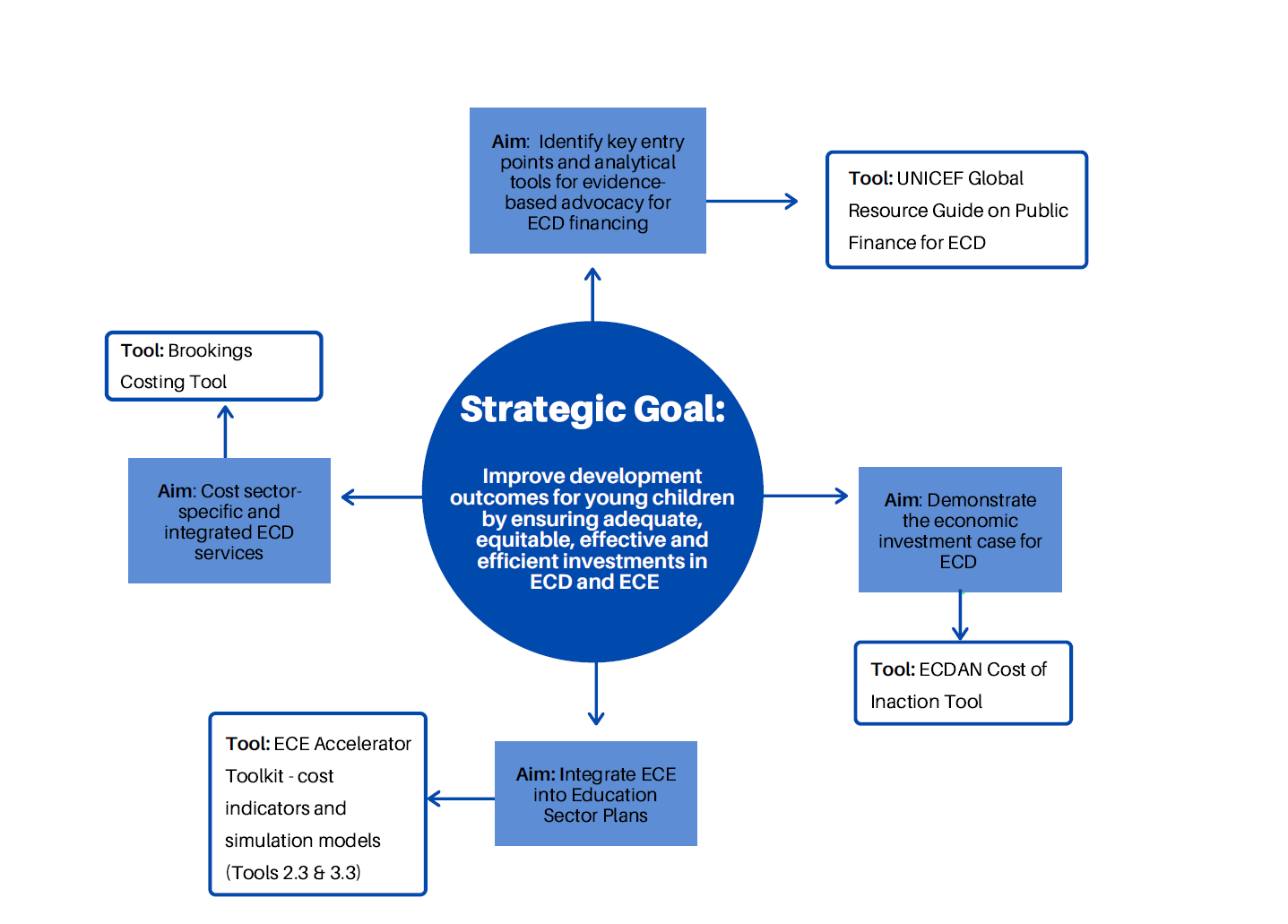 While multisectoral interventions for young children and parents are essential for providing comprehensive opportunities for ECD, these interventions can be difficult to plan, estimate costs, and monitor, as they cover a wide range of services, sectors, and government agencies. Understanding the financial costs and socioeconomic benefits of these services is essential to protect and promote ECD financing as countries grapple with the fiscal crisis wrought by the pandemic. The guidance documents and tools presented in our CIES session and described below demonstrate how the ECD community has worked together to provide concrete solutions to the many pressing ECD and ECE challenges (see infographic below).