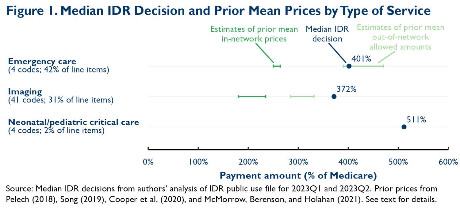 The prices emerging from IDR also appear to greatly exceed estimates of historical mean in-network commercial prices for these services. We examined four studies using data for 2014 or later that reported mean in-network prices for emergency care services, imaging services, or both relative to Medicare’s prices.4 For emergency care, estimates ranged from 2.5 to 2.6 times Medicare’s price. For imaging, estimates ranged from 1.8 to 2.4 times Medicare’s price. For both categories, median IDR decisions relative to Medicare are at least 50% higher than even the top end of these ranges. We are not aware of similar estimates for neonatal/pediatric critical care services, so we cannot make similar comparisons.