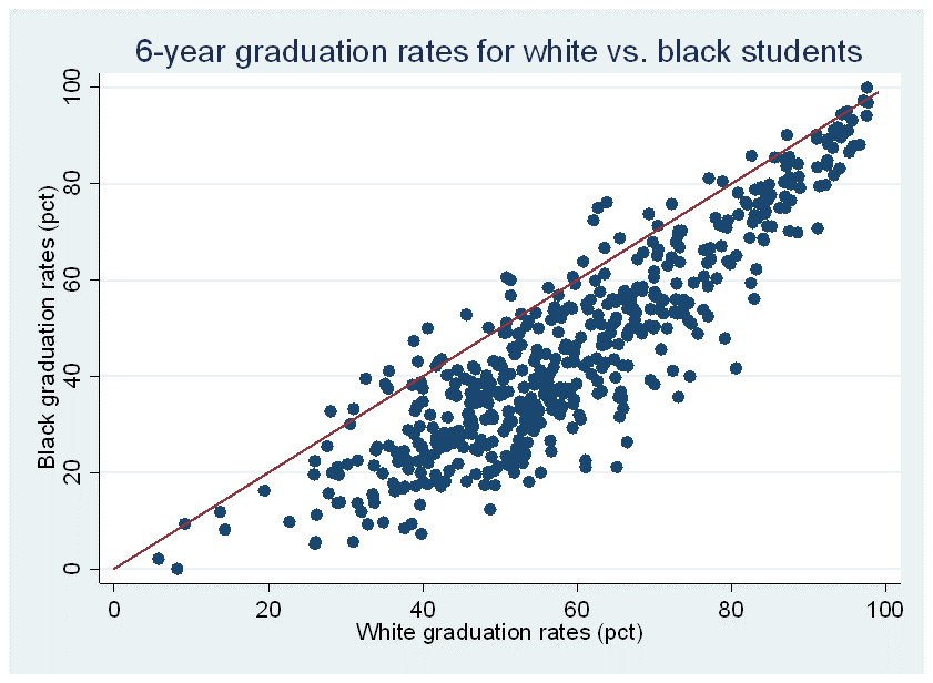 As a comparison, I also examined the black/white graduation rate gaps for the 499 colleges that had at least 50 black and 50 white students in their graduation rate cohorts. The average black/white graduation rate gap at these colleges was 13.5 percent (59.0 percent for white students compared to 45.5 percent for black students). As the figure shows below, only 39 colleges had higher graduation rates for black students than for white students, while the other 460 colleges had higher graduation rates for white students than black students.