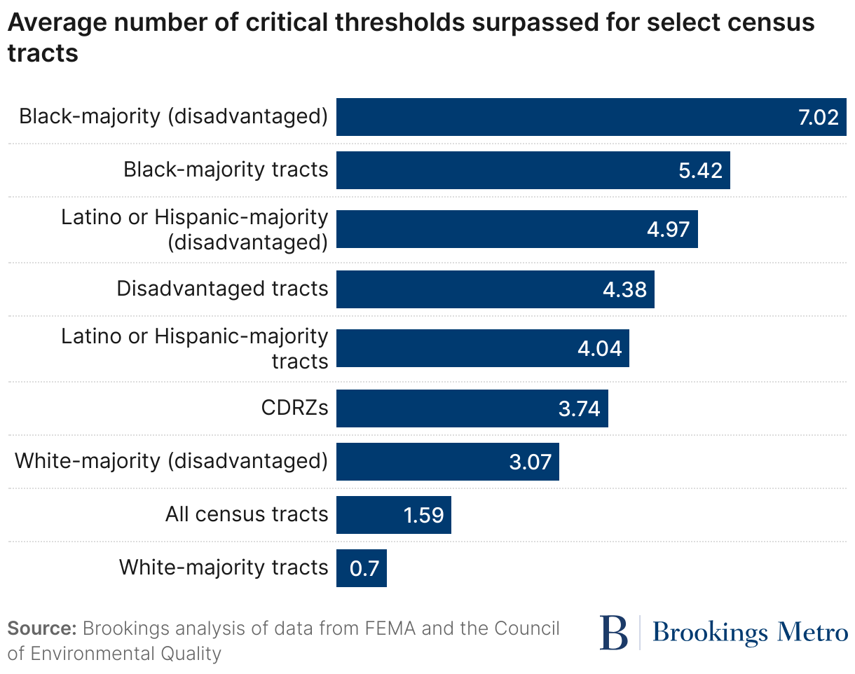 While the majority (84.1%) of all CDRZs are identified as disadvantaged, the number of critical thresholds surpassed for CDRZs is, on average, lower than most disadvantaged tracts. The average number of surpassed thresholds for CDRZs is 3.74 (out of a possible eight), and for disadvantaged tracts, it is 4.38.