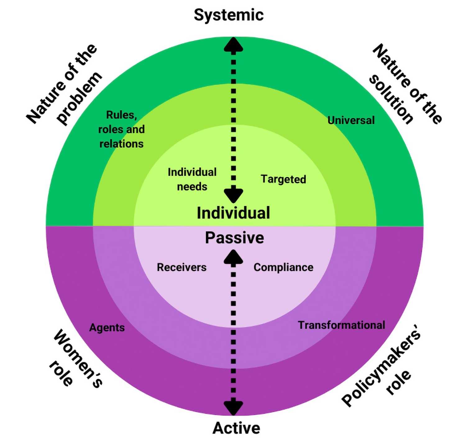 The research showed how policymakers’ mental models relate to WEA policies in four different ways: how they understand the nature of the problem and the solution, and the way they frame women’s role and their own in relation to policy. These mindsets are represented as a Mindset Map (Figure 2) to illustrate the complexity of decision making and the multiple narratives that shape policymakers’ approaches to WEA. The Mindset Map can be used as a tool for navigating the continuum of beliefs and assumptions that policymakers hold with respect to WEA and gender equality in general.