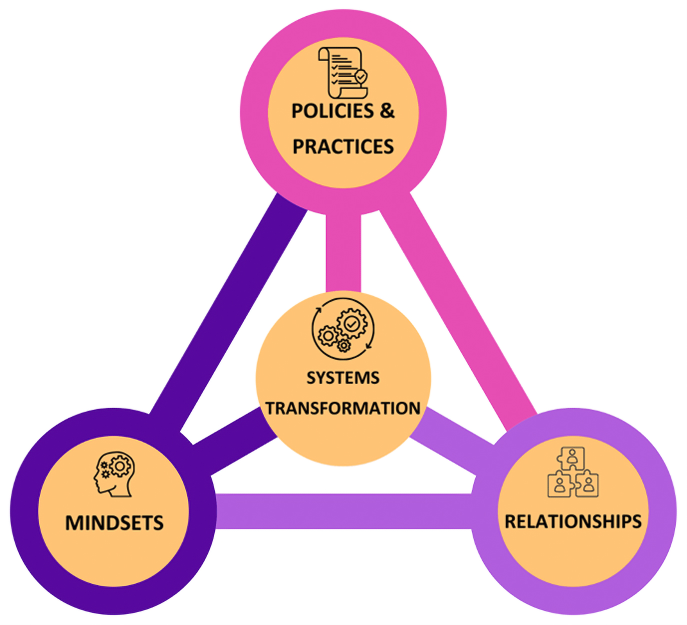 To address these challenges and advance marginalized women’s economic autonomy in Mexico, it is crucial to understand and shift the mental models that will allow systems transformation to tackle inequality, rather than perpetuate it. Particularly uncovering policymakers’ mindsets, their habits of thought, deeply held beliefs, and assumptions about gender equality and WEA and how that influences their relationships, policy responses and practices (Figure 1).