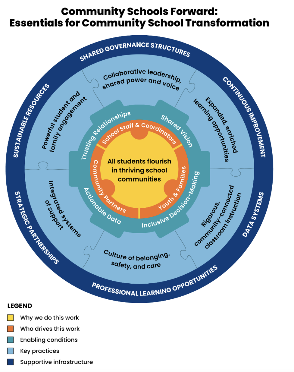 Over the past two years, a national collaboration called Community Schools Forward has highlighted how the community schools strategy aligns with evidence-based practice and research. The collaboration has developed a number of resources to illustrate that alignment, including a framework capturing the essential elements for high-quality community school implementation.