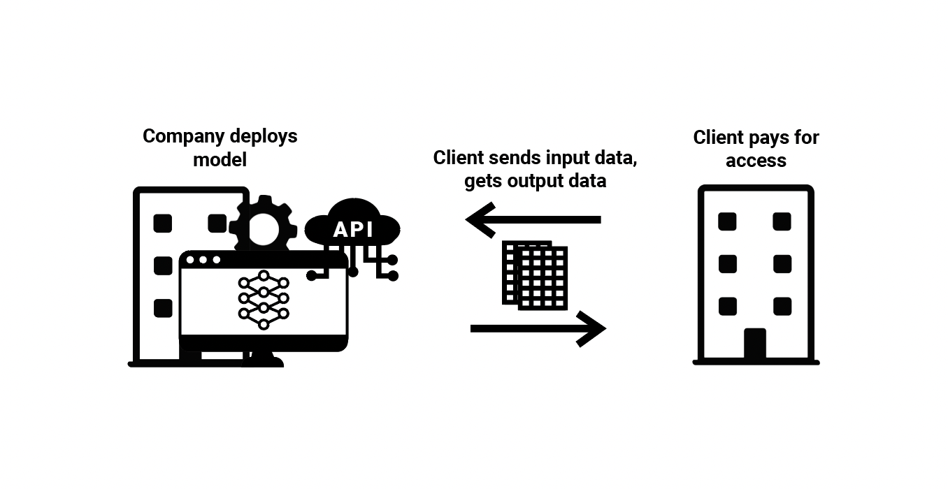 (3) Restricted ML Model Access—A company writes the code and fully trains ML models within a branded application or an application programming interface (API), and then sells access to that application. The company is enabling access to an ML model, but only through closed-source software or an API, preventing any changes to the model. Clients can only submit input data to the ML model and receive outputs back. A company that charges for use of an ML model for image generation based on text prompts, submitted over API, is an example of this ML value chain.