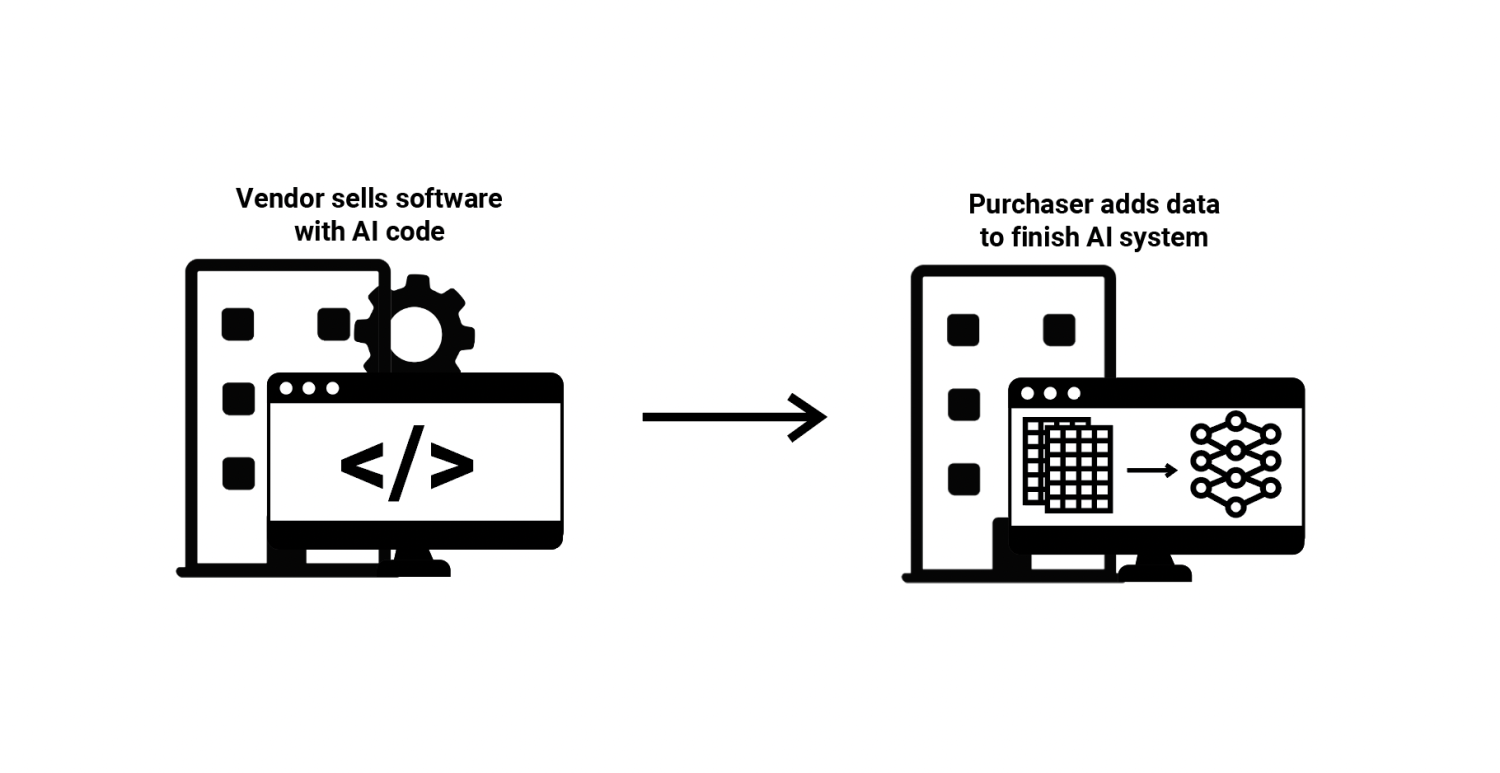 (4) Software with ML Code—A vendor builds software which includes code for training a specific application of an ML model, but the vendor does not provide the data itself or any trained ML models. In this situation, the vendor develops software that includes a process for a client to enter training data of a pre-specified format, which the software can then use to automatically train an ML model. The client purchases the software, adds this training data and further input data, which triggers the automatic ML model creation and then returns new results. At times, the vendor may also provide technical assistance to its clients during this process.