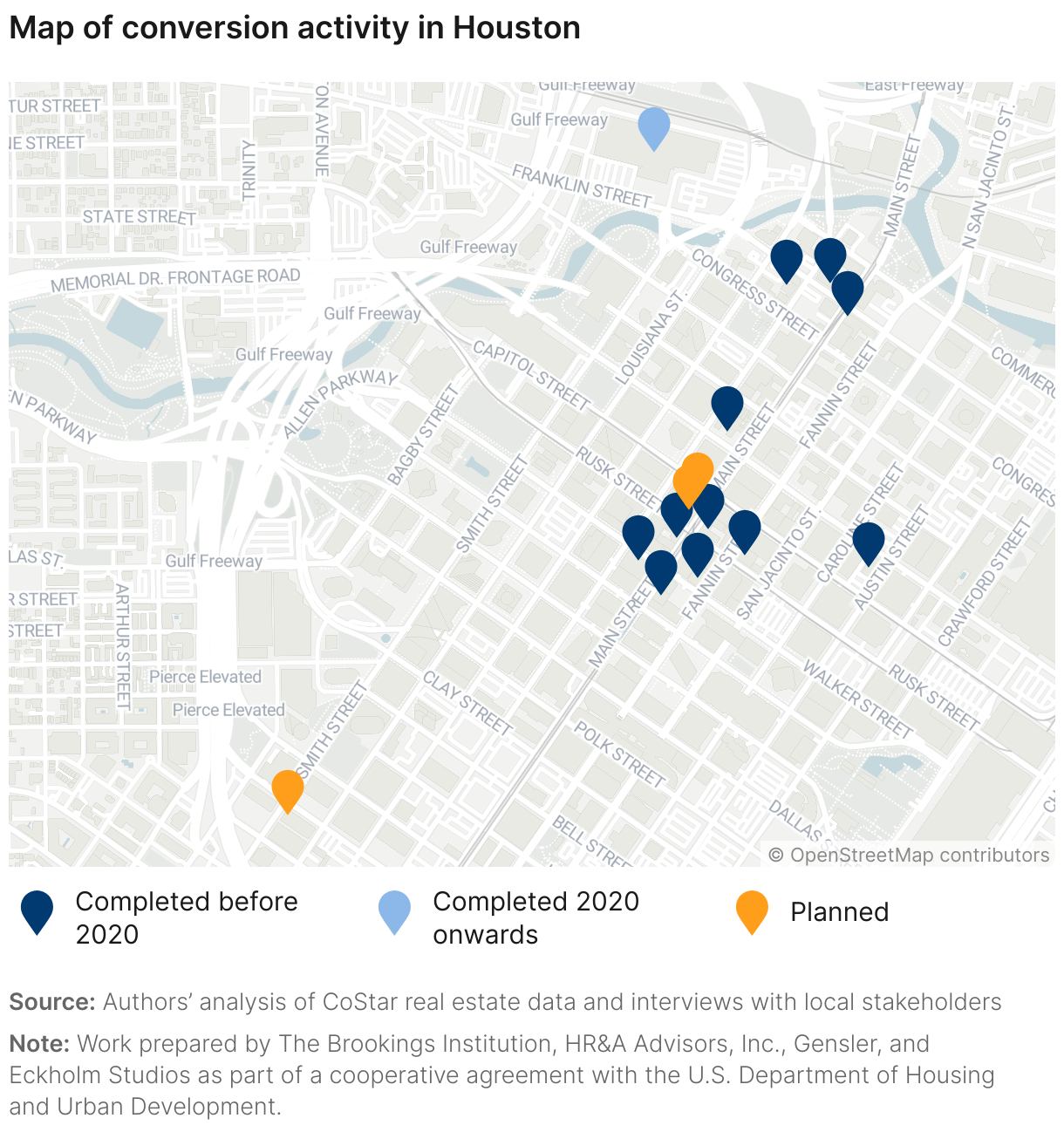 This publication is part of a broader series examining the potential of office-to-residential conversions across six U.S. case studies. The project is part of a cooperative agreement with the US Department of Housing and Urban Development, and the research team is composed of contributors from Gensler, HR&A Advisors, Brookings, and Eckholm Studios.