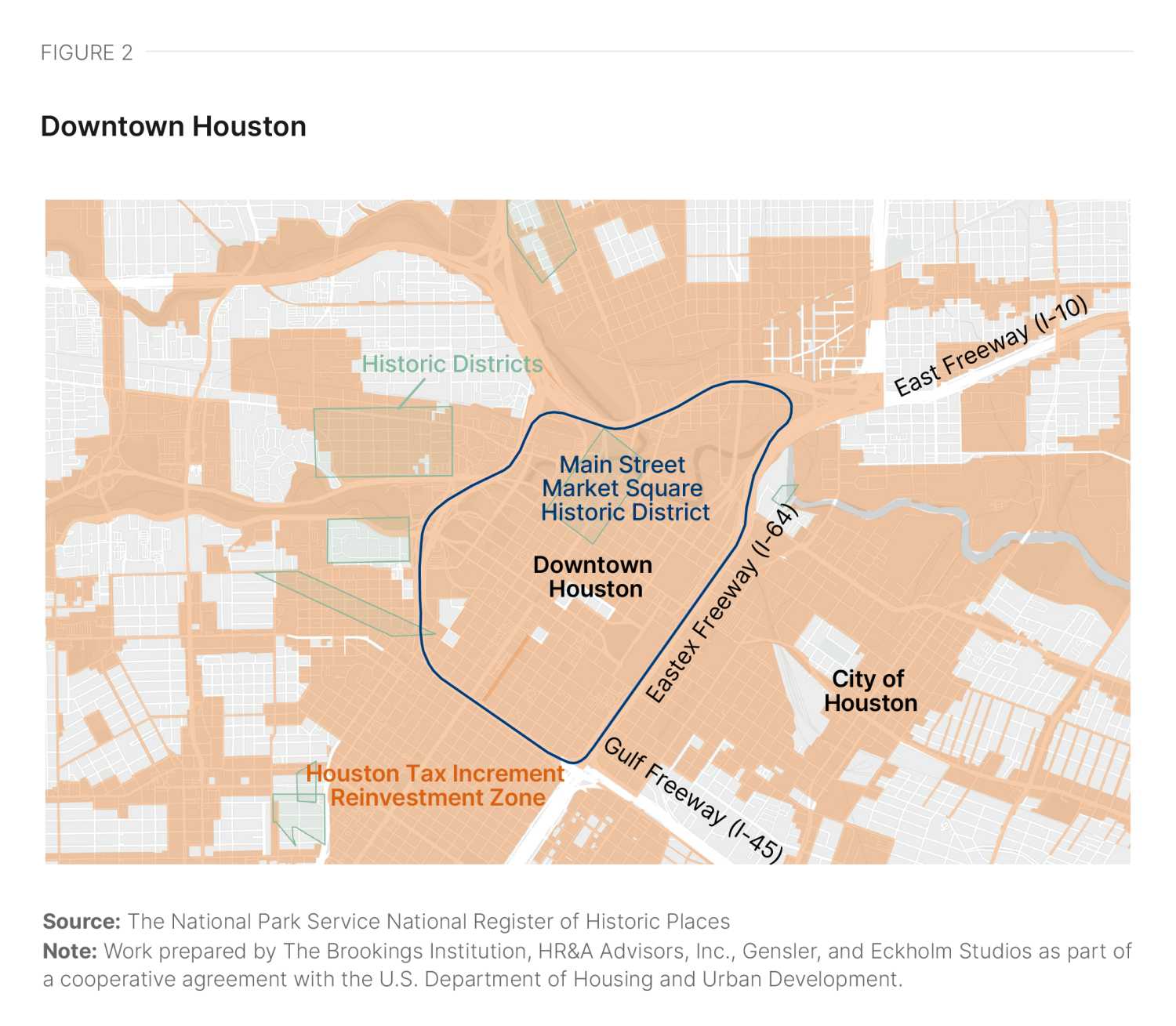 Downtown Houston covers a 1.7-mile area bounded by the interchanges between the Eastex Freeway (I-69), East Freeway (I-10), and Gulf Freeway (I-45) (Figure 2). Downtown contains a mix of recently built and renovated buildings and historic structures dating back to the 1800s. It includes the Main Street Market Square Historic District and more than 40 buildings listed on the National Register of Historic Places. Many downtown Houston offices share a private tunnel system that was primarily built out in the 1960s and 1970s. The tunnels are air conditioned and, prior to the pandemic, were also home to many small retail operations.