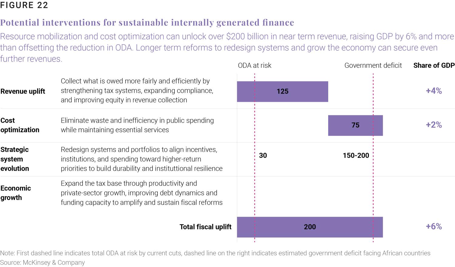 Mobilize domestic resources: Africa’s average tax-to- GDP ratio is 16% (well below the 34% average for OECD countries) but has significant variation. As of 2022, Somalia, Congo, Equatorial Guinea, and Niger have tax-to-GDP ratios below 10%, but Tunisia and Morocco have managed to reach over 30%.6 This gap could potentially be addressed domestically through key levers such as improving tax collection (without harming growth); expanding non-tax revenue; as well as government cost optimization (Figure 22). This is more than sufficient to cover the gap created by retreating ODA. (For a more detailed discussion on strategies to mobilize Africa’s own resources for development, see Chapter 1.)
