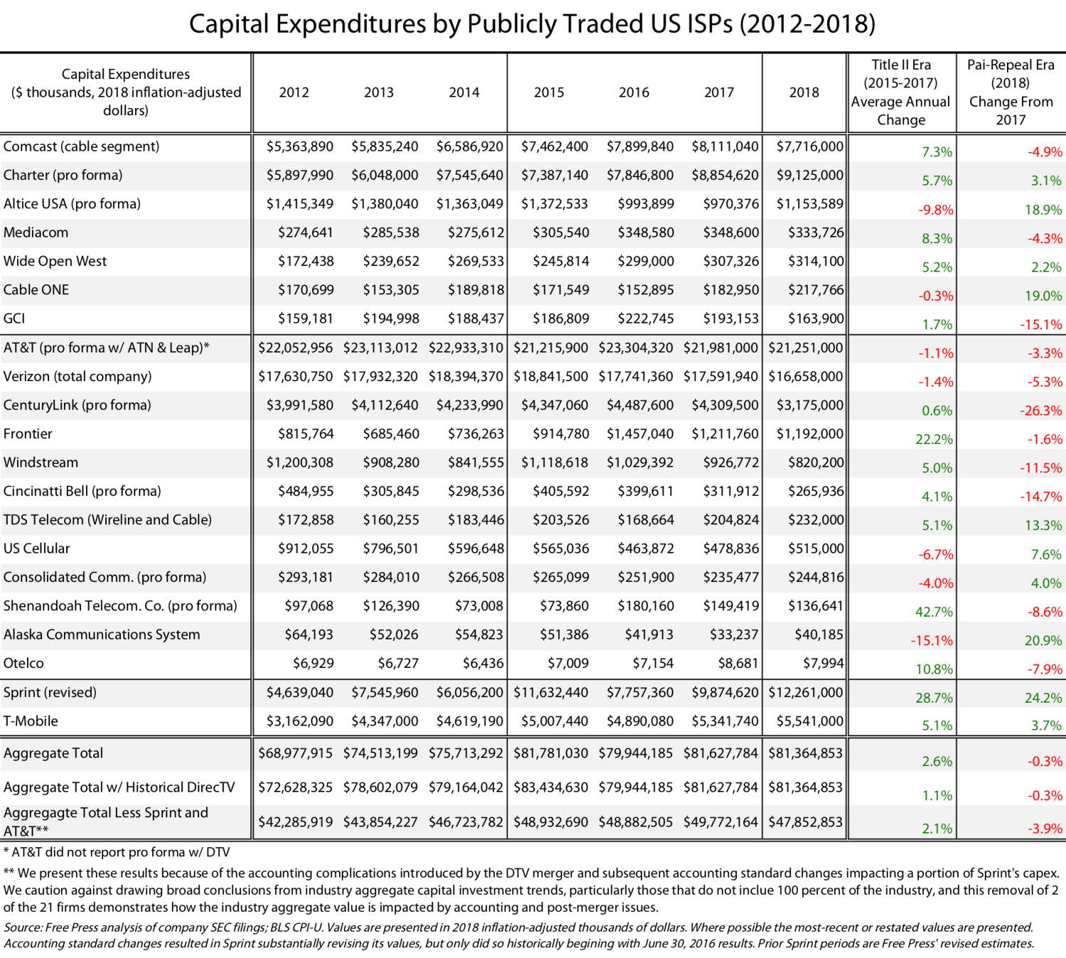 The companies are spending millions of dollars asserting a harm to broadband investment that has been disproven by their own actions. As the study below by the public interest group Free Press demonstrates, capital expenditures by publicly traded broadband providers increased during the years net neutrality was in effect and declined after the Trump FCC’s repeal.