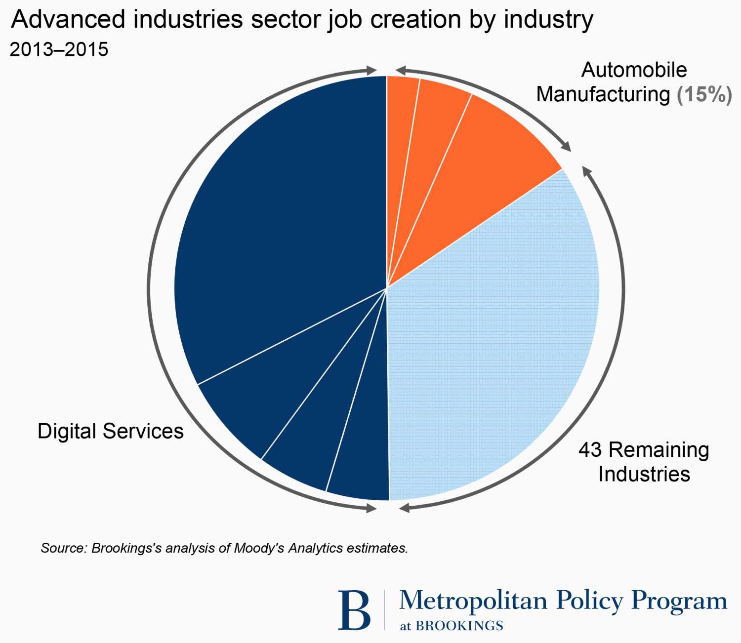 - Growth, however, emanated from a narrower set of auto manufacturing and “tech” service industries in the last two years. In fact, just three auto industries and four digital services industries accounted for more than 60 percent of the nation’s advanced-sector growth over the time period.
