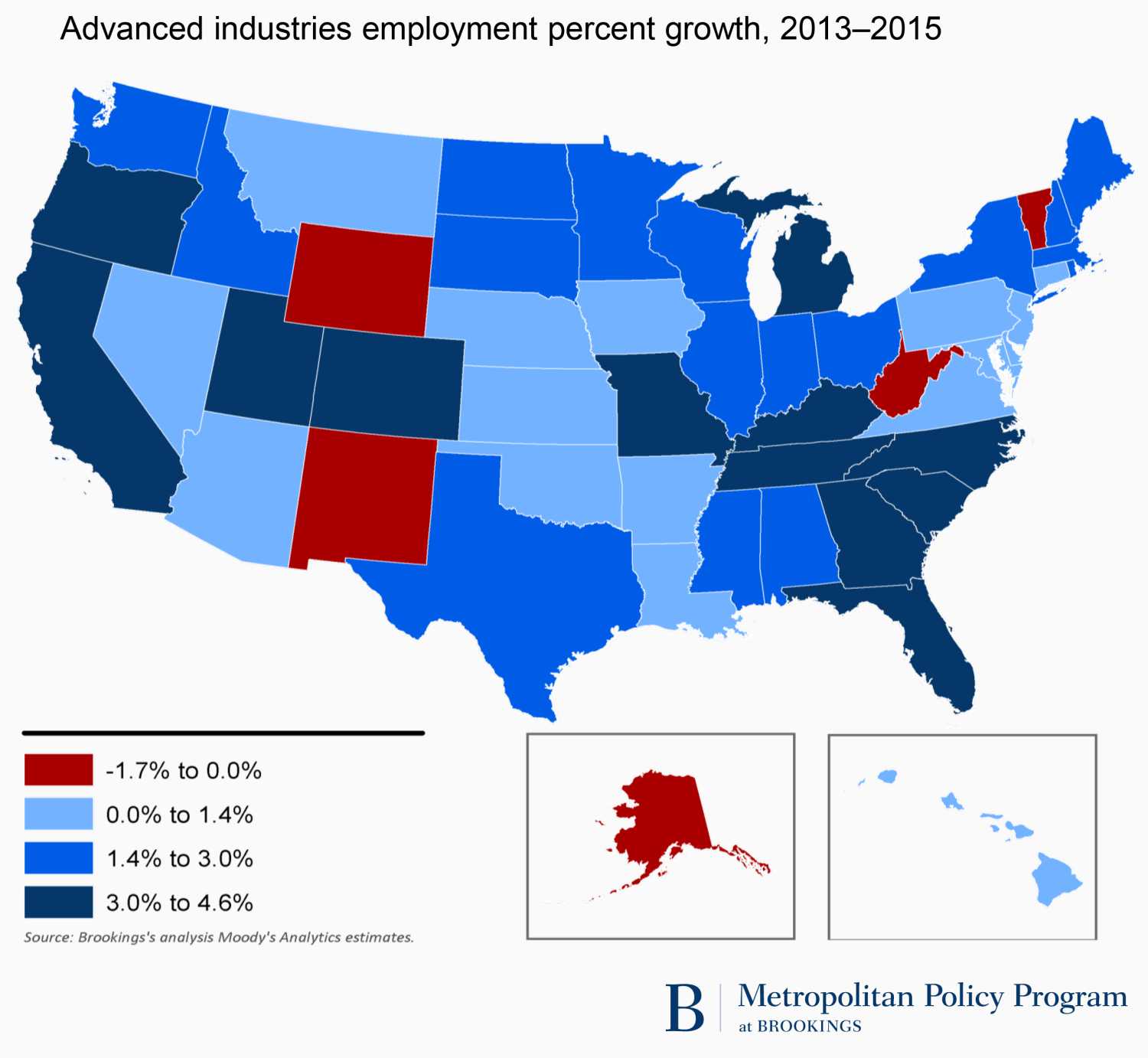 So how, then, are America’s advanced industries doing? A new analysis of the growth and geography of the sector’s 50 industries covering the period from late 2013 to late 2015 finds that multiple high-tech service industries were booming as a “new normal” set in even as growth in advanced manufacturing and energy industries slowed slightly or in the latter case ceased.