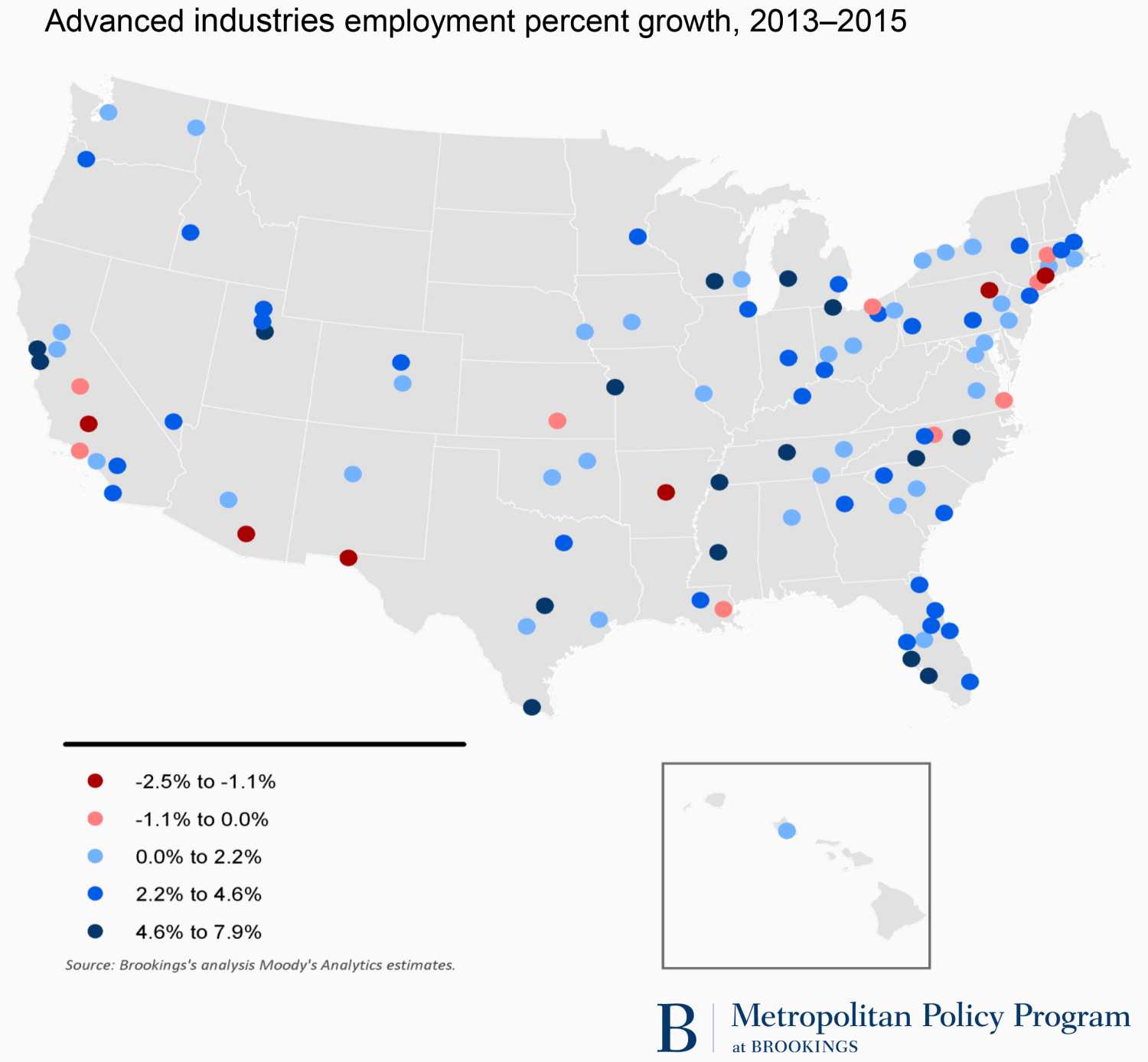 To start with, recent trends reflect the wide dispersal of advanced industries in metropolitan America. Many metros in many states and regions continued to maintain solid advanced industry enterprises as the national economic recovery settled into a “new normal” of economic performance between 2013 and 2015.