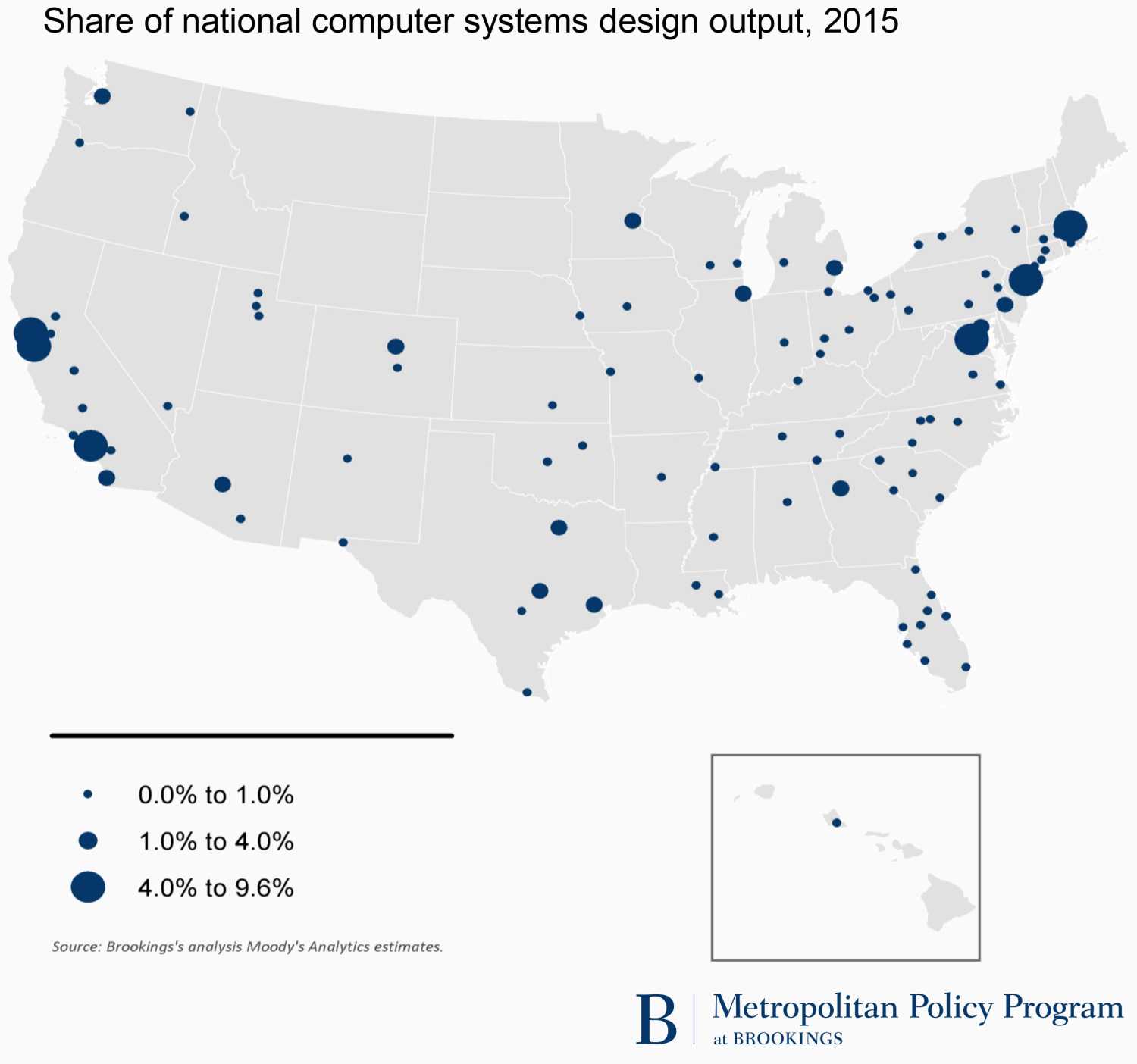Not only did the industry generate nearly one-third (198,000) of the entire advanced sector’s job creation between 2013 and 2015, but its geographical reach extended far beyond the conventionally assumed “tech” geography. To be sure, nearly 38 percent of the industry’s 2015 national employment is concentrated in just six metro areas—Washington, D.C.; New York, N.Y.; San Francisco, Calif.; San Jose, Calif.; Boston, Mass.; and Los Angeles, Calif.—that also receive more than 70 percent of national IT-industries venture capital. These six locations would seem to be the industry’s core “creative hubs”—and the ones most oriented to earlier-stage invention. However, what is striking is the geographical breadth of the computer systems design industry. No less than 71 of the nation’s largest metros, ranging from Jacksonville, Fla., to Spokane, Wash., feature computer systems design as one of its largest three sources of advanced industries’ employment and growth. This broad array of metros would seem to reflect less the creative side of the industry than its applications side. These “installation” metros are likely places where the industry is busy deploying technologies and systems designed in the creative hubs. As such, this less glamorous majority of the industry is likely occupied with the crucial work of technology “diffusion”—installing technologies and practices that will improve the productivity of relatively stagnant industries beyond the more famous technology hubs.