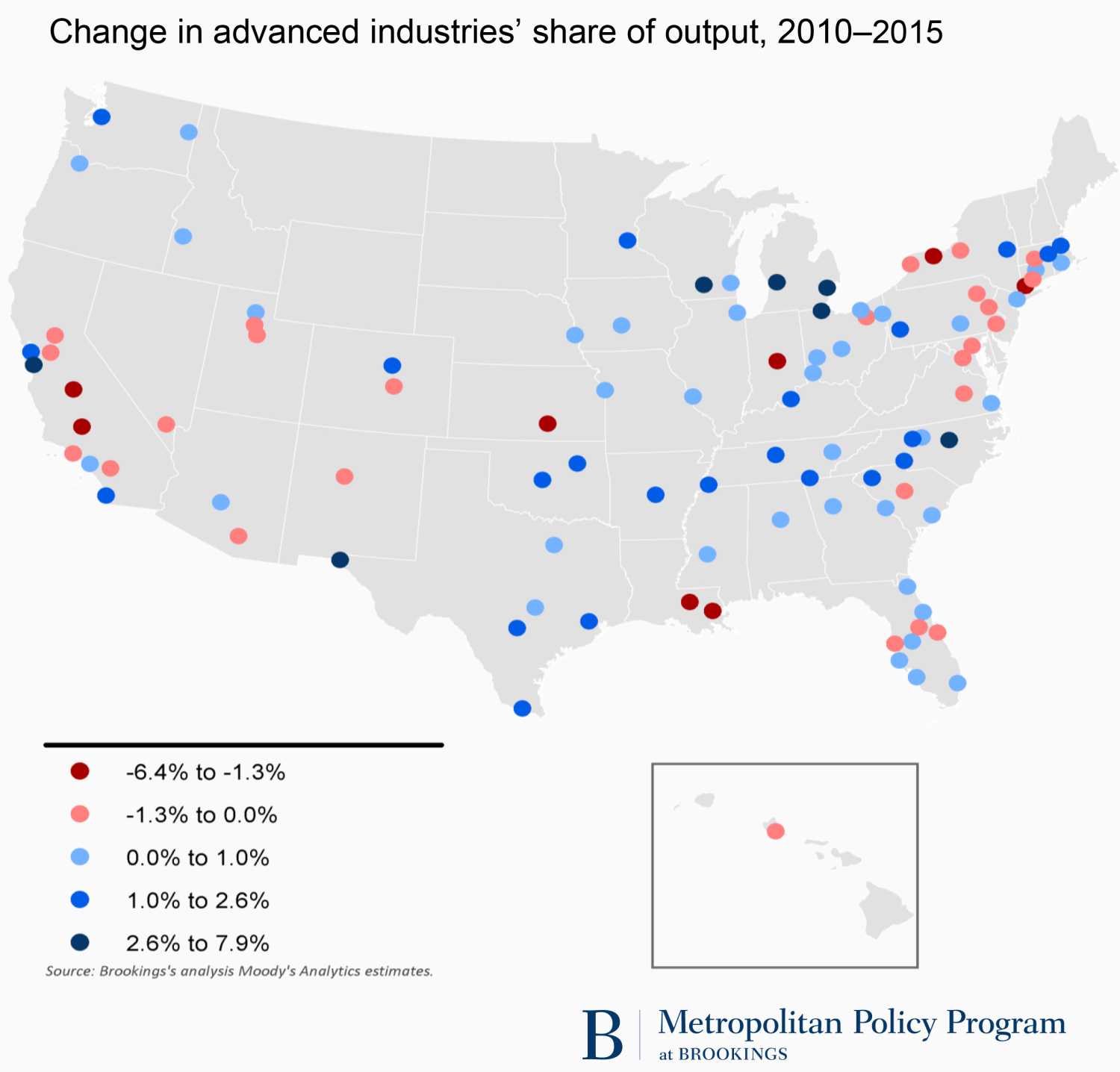 - The sector’s distribution grew more uneven across the country between 2013 and 2015. While a solid minority of the nation’s largest 100 metros achieved strong advanced-sector growth, some 59 saw advanced sector output or employment slow in those years.