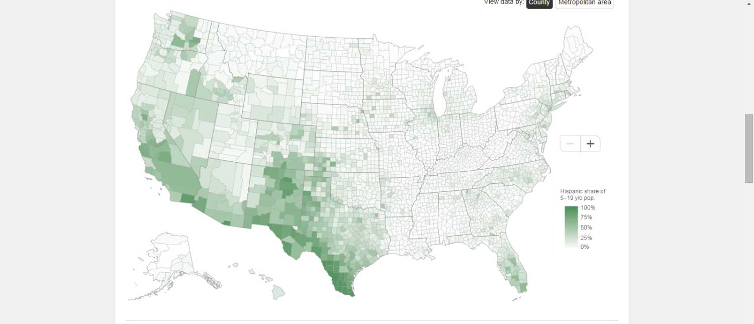 Of course, metro areas such as Los Angeles, Miami, and New York are used to accommodating large numbers of young children from dozens of foreign countries. Yet the first-generation immigrant children in large sections of the Southeast and Mountain West and scattered parts of “middle America” represent the front lines of the country’s diversity explosion. For an overview of U.S. county profiles by race and age, see the U.S. interactive map.