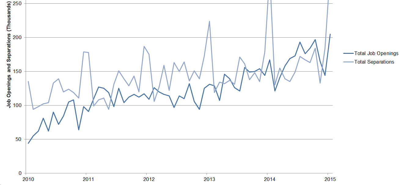 At the same time, while many of these jobs experience seasonal fluctutations—especially in trucking, where hiring typically accelerates before the holiday season—transportation-warehousing-utilities has seen a consistent climb in job openings since the end of the recession. In January 2010, there were only 44,000 openings in the sector, but five years later this number had jumped to 205,000. Openings jumped 23 percent over the past year alone. Meanwhile, the number of separations—which includes workers who quit as well as those who are laid off—has continued to surge, signaling the high turnover and urgent need for talent in these jobs while placing upward pressure on wages.