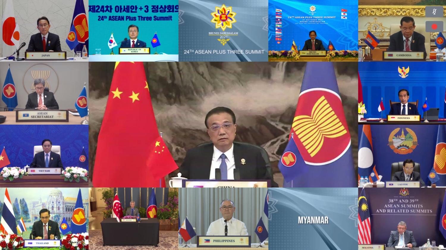 China Premier Li Keqiang attends Southeast Asian leaders virtual summit Tuesday October 26, 2021 without Myanmar military leader Min Aung Hlaing after its top general failure of Myanmar's army to adhere to a peace road map it had agreed with the southeast Asian bloc following the coup in February. The exclusion of Senior General Min Aung Hlaing was an embarrassment for Myanmar's military and the harshest rebuke by the Association of Southeast Asian Nations since the military ousted civilian leader Aung San Suu Kyi and took over the government on February 1. During the meeting on Tuesday Sultan of Brunei Darussalam Haji Hassanal Bolkiah said he welcomed the inclusion of Britain as the first new dialogue partner of ASEAN in over two decades. There were three separate meetings between the ASEAN leaders and leaders of the United States, China, and South Korea.