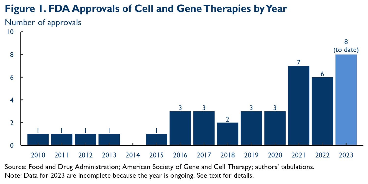 - For these purposes, we include products listed by the FDA’s Office of Tissues and Advanced Therapies (excluding cord blood therapies and Wilate) as of December 7, 2023, plus two therapies for sickle cell disease approved on December 8, 2023, as well as non-vaccine RNA therapies listed in an October 2023 report by the American Society of Gene and Cell Therapy that are approved in the United States. We obtain approval dates from the FDA Orange Book or Purple Book, as relevant.