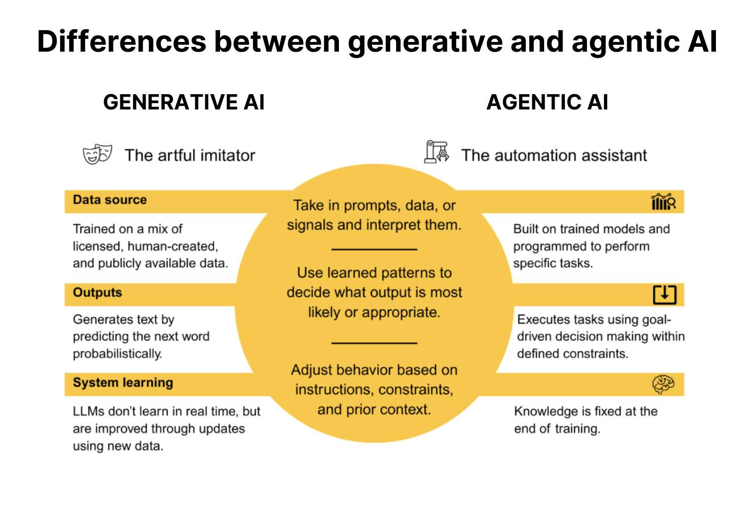 While modeled after human thought processes, generative AI does not replicate human thought; it makes a statistically informed guess in response to a user-generated prompt. A generative model’s data corpus is often frozen at the point in time that it completed its training—the implication being that if, for example, a new law was enacted or a major new event occurred, the model would not be aware of those developments without additional training. The model cannot autonomously adapt to new developments as they occur. While agentic AI relies on generative models, it differs in that it is entirely autonomous and dependent on a chain of chatbots to complete a task (see Figure 1).