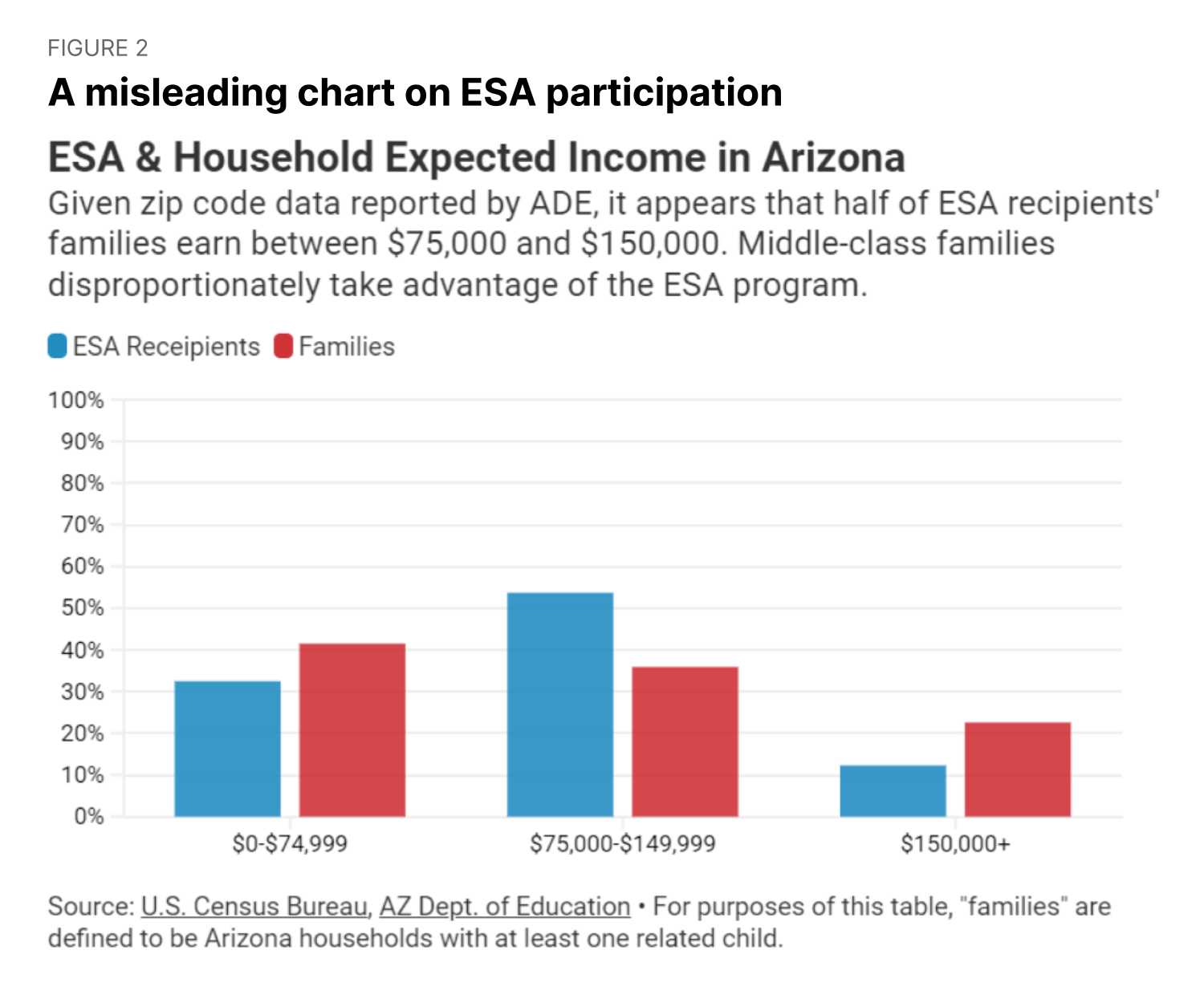 It’s because CSI presented an apples-to-oranges comparison that’s bound to tell that story. The data issue is subtle, but they present ZIP code-level data for ESA recipients (blue bars, on the left) and household-level data for families (red bars, on the right). Many households in Arizona make $150,000 or more, so the far-right, red bar is quite tall. However, few ZIP codes have enough households earning more than $150,000 that the median household income rises above that threshold. As a result, many ESA recipients who earn more than $150,000 aren’t included in the $150,000+ category in this chart. Instead, these households—which earn more than $150,000 themselves but live in ZIP codes where the median income is below $150,000—are included in one of the other blue bars.