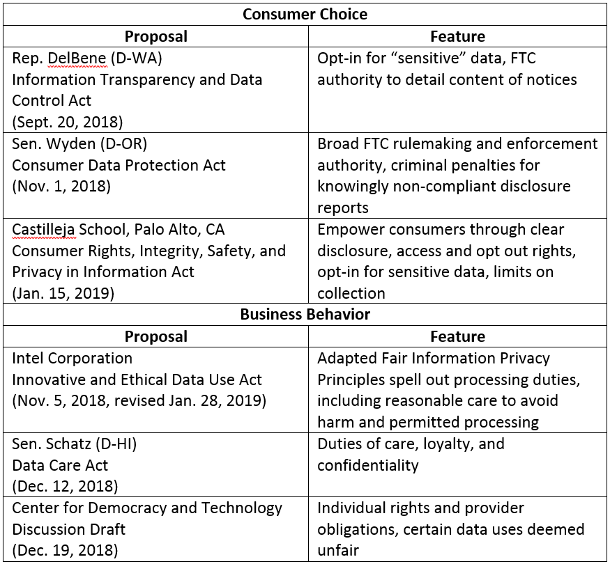 “Several of the draft bills present concrete signs of an emerging shift in the underlying model for privacy regulation in the current discussion, from one based on consumer choice to another focused on business behavior in handling data.”