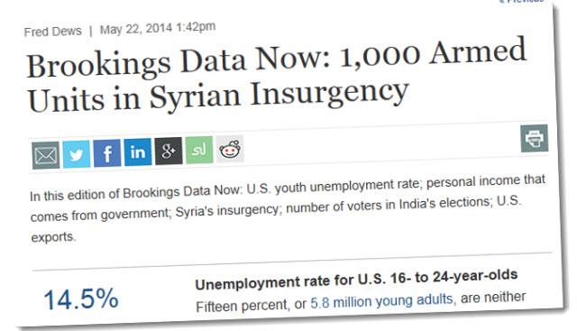 In this edition of Brookings Data Now: U.S. youth unemployment rate; personal income that comes from government; Syria’s insurgency; number of voters in India’s elections; U.S. exports.