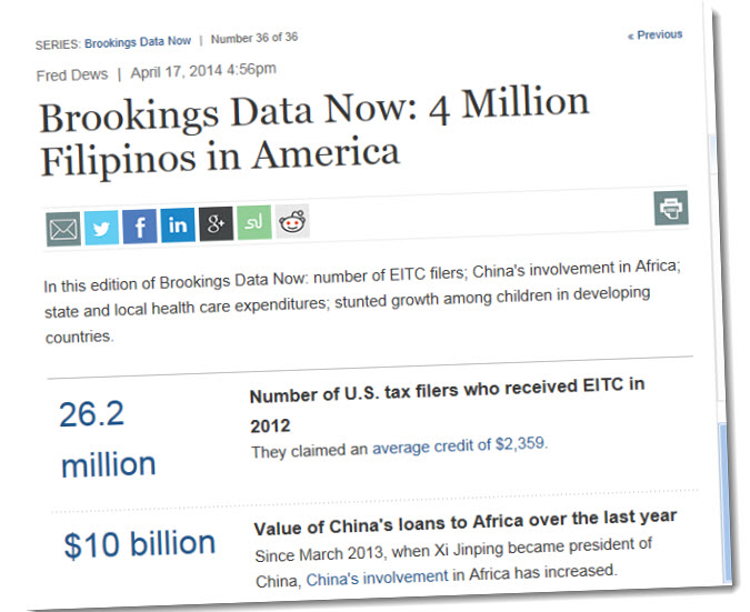 In this edition of Brookings Data Now: number of EITC filers; China’s involvement in Africa; state and local health care expenditures; stunted growth among children in developing countries.