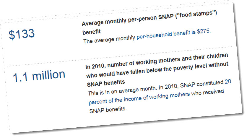 In 2010, number of working mothers and their children who would have fallen below the poverty level without SNAP benefitsThis is in an average month. In 2010, SNAP constituted 20 percent of the income of working mothers who received SNAP benefits. |