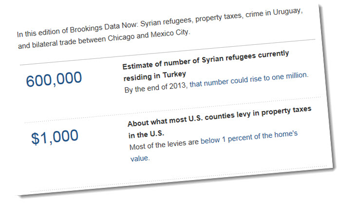 In this edition of Brookings Data Now: Syrian refugees, property taxes, crime in Uruguay, and bilateral trade between Chicago and Mexico City.