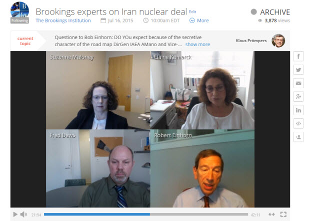 On Thursday morning, Brookings hosted a live online discussion around this week’s historic deal with Iran. Joining the conversation were senior fellows Suzanne Maloney, an expert on Iran; Robert Einhorn, a former U.S. nuclear negotiator with Iran; and Elaine Kamarck,former member of the Clinton administration and expert on American policy and politics.
