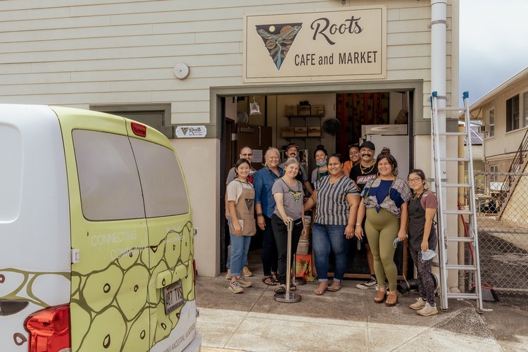 Staff at the Roots Café and Market – a food hub that supports small and micro-producers to sell their healthy food products from the KKV Wellness Center to provide healthy options like free-range eggs, fresh poi, local fish, breadfruit, kalo, cassava, banana, and leafy greens to the Kalihi community | Photo credit: Kaʻōhua Lucas