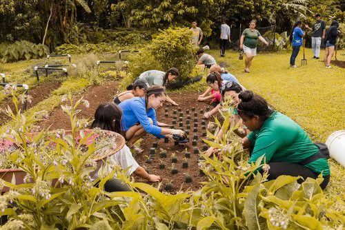 Malama ʻāina (meaning “caring for and honoring the land”) in the garden at Hoʻoulu ʻĀina as community work together to grow food for Kalihi kūpuna (elders). Through engaging in indigenous Hawaiian food cultivation practices, Kalihi residents are reminded of the link between the well-being of the land and the well-being of the community. | Photo credit: Kaʻōhua Lucas