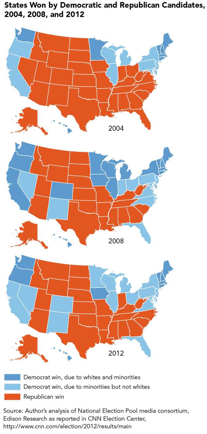 A key to Obama’s wins in 2008 and 2012 was his ability to take several Southern and Western states previously dependably Republican. Changes in the racial demography of these states—the dispersion of Hispanics across the Sun Belt and the ongoing return of blacks to the South—had much to do with this. The three maps displayed below depicting state outcomes in the last three presidential elections make this plain.