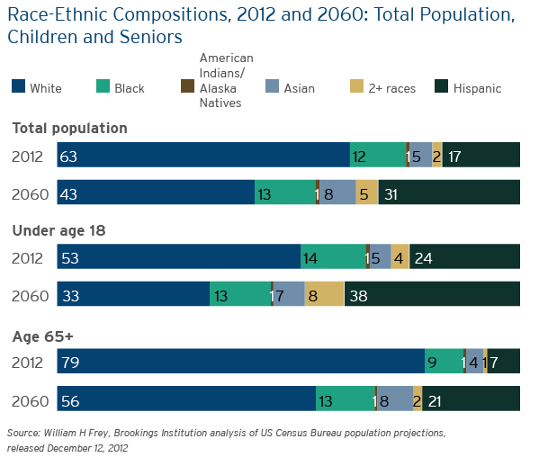 Editor’s Note: Based on new Census data, the U.S. Census Bureau recently released its first set of U.S. population projections for 2012-2060; the data reveals projections of the nation’s population by age, race and Hispanic origin for the next 50 years. William Frey further discusses these projections and how they will reverberate through U.S. politics, education system, and labor force. Also featured are William Frey ‘s related publications, which discuss and highlight key trends in the U.S. demographic shift.