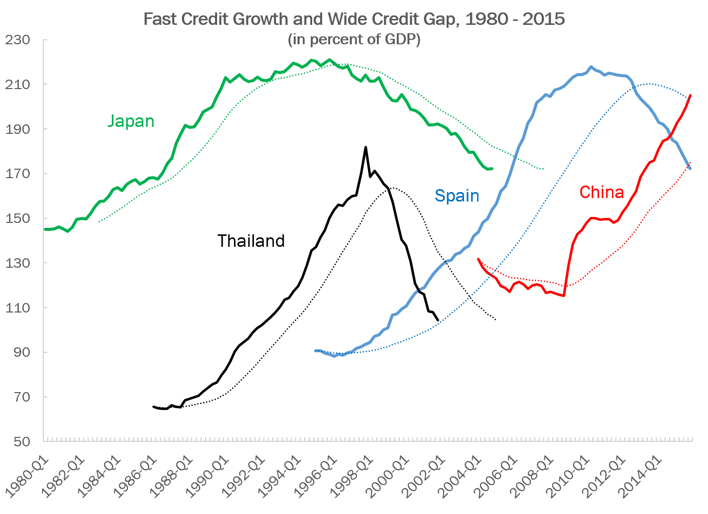 Excessively fast credit growth is a good predictor of financial crises. The Bank for International Settlements (BIS) calculates the “credit gap” as the difference between actual credit growth and trend.