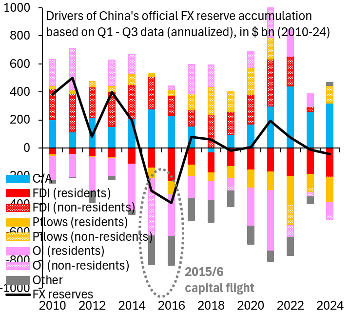 Figure 7. Drivers of China’s official foreign exchange reserve accumulation based on Q1-Q3 data (annualized) in billions of dollars (2010-24)