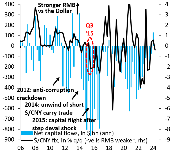 Given how much focus there is on potential understatement of China’s current account surplus, we now investigate this issue. Figure 5 presents annual data for the current account from 2010 to 2023, breaking down the headline number into a non-commodity trade surplus (blue), trade deficits for oil (red) and iron ore (pink), and services and income balances. Figure 6 shows the same breakdown for the first quarter in every year from 2010 to 2024. China’s current account surplus has been below the non-commodity trade surplus for many years, with this discrepancy most notable in the years since COVID-19. With this being a long-standing issue, this discrepancy is unlikely to explain an acceleration in capital outflows, even if the current account surplus is understated. In our view, the current account understatement argument is a red herring.