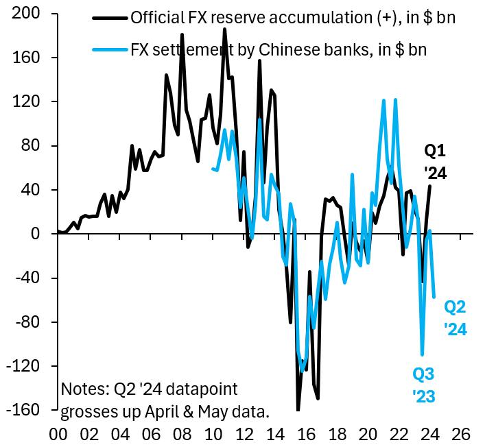 Figure 7. China’s official foreign exchange reserve accumulation and settlement by Chinese banks, in billions of dollars