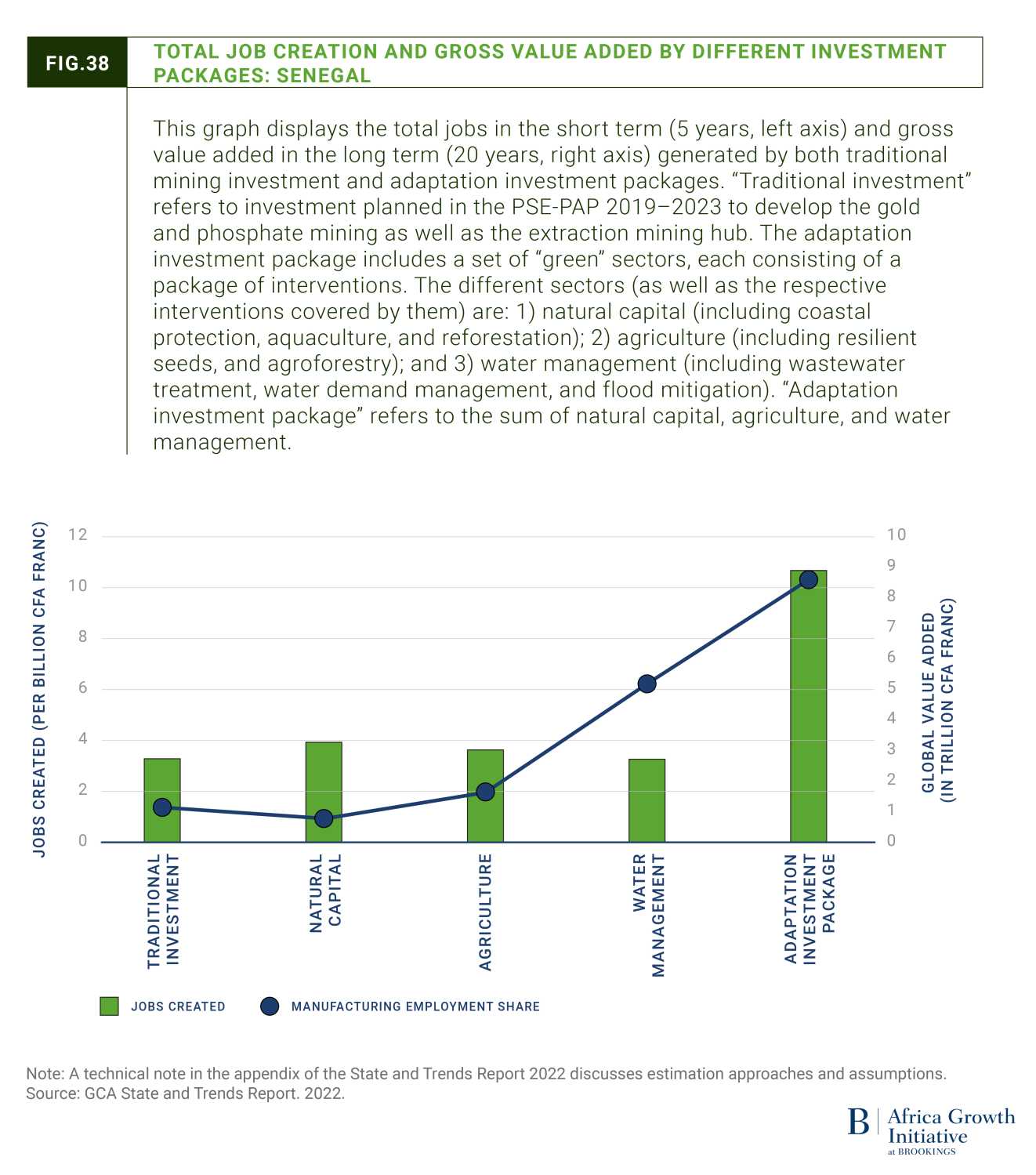 In every country, the economic returns and jobs generated are higher in an adaptationfocused stimulus package (see Figure 38 below). For example, our modelling shows that in Senegal, investment in adaptation initiatives could create over 200 percent more jobs within five years (600 percent within 20 years) and around 700 percent greater economic value in 20 years) relative to a traditional stimulus financial package focused on gold and phosphate mining and the extraction mining hub. The adaptationfocused package includes investments in natural capital (e.g., coastal protection, aquaculture, and reforestation), agriculture (e.g., resilient seeds and agroforestry), and water management (e.g., water demand management and flood mitigation).