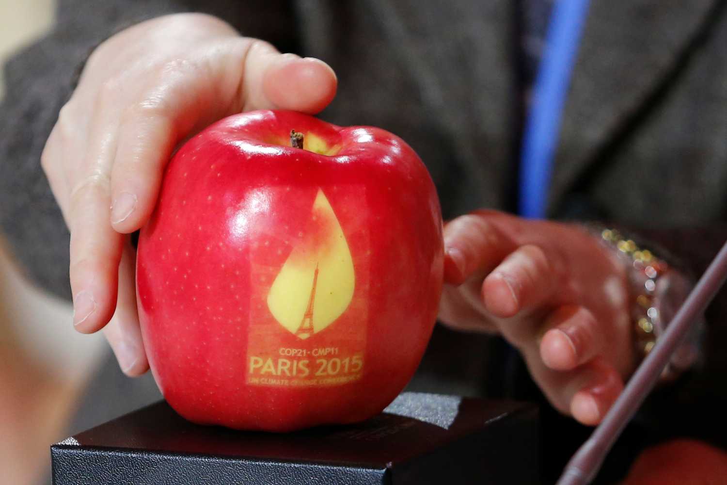 Reuters/Stephane Mahe – A participant holds an apple marked with the logo of the World Climate Change Conference 2015 (COP21) during a meeting at Le Bourget, near Paris, France, December 7, 2015