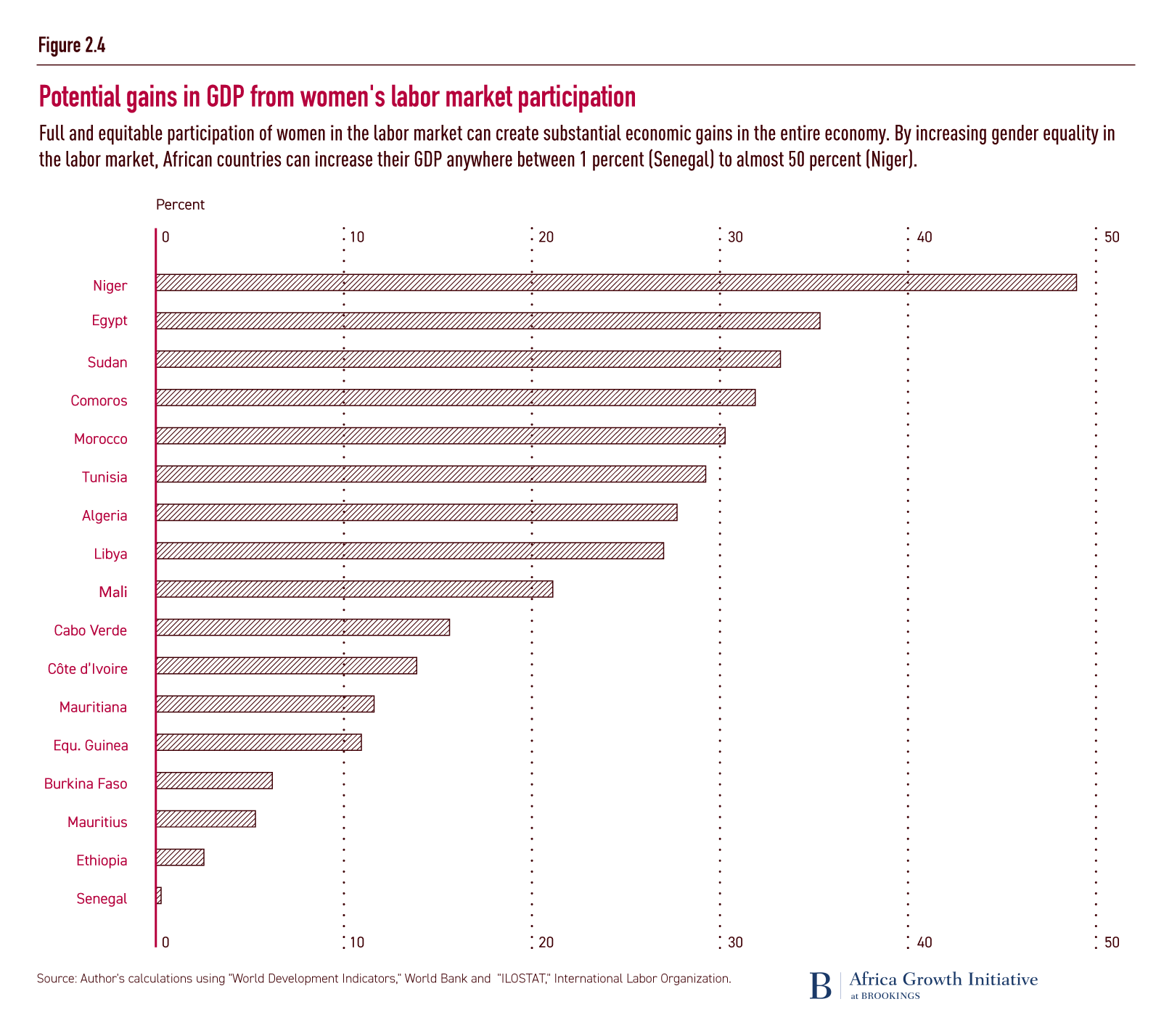 Had African countries with lower relative female-to-male participation rates in 2018 had the same rates as advanced countries, the continent would have gained an additional 44 million women actively participating in its labor markets. By increasing gender equality in the labor market, the gain in GDP ranges from 1 percent in Senegal to 50 percent in Niger (Figure 2.4).