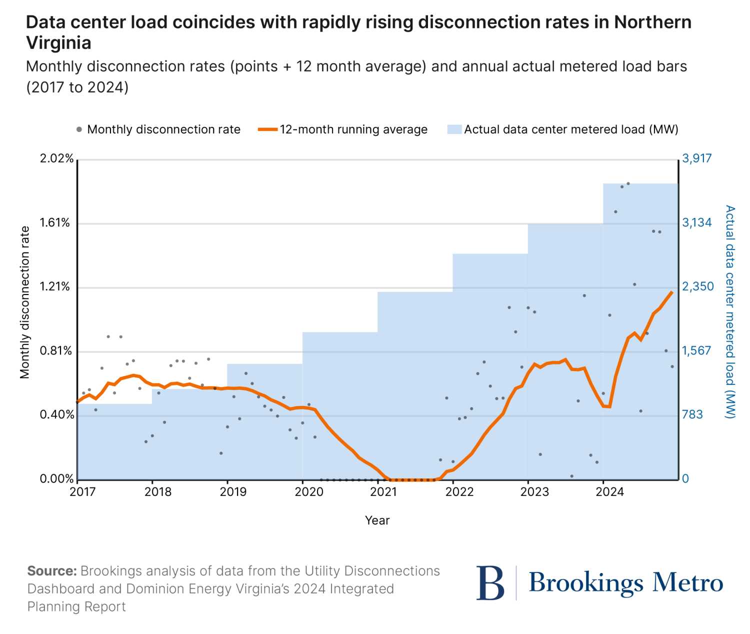 As the number of data centers has increased, the rise in load has coincided with more residential disconnections. Since 2022, the 12-month running average of disconnections in Dominion’s service area has increased 1.1 percentage points, while the metered load associated with data centers has increased by 31%. Other variables—including the COVID-19 pandemic, as well as changing customer allocation of costs among commercial, industrial, and residential segments—have likely had impacts as well. But a general point is clear: Disconnections are a signal of decreasing affordability in a market where utility spending is expected to continue rising.
