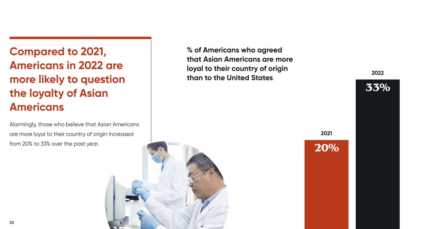 The 2022 STAATUS Index shows that 1 in 5 Americans believe that Asian Americans are at least partly responsible for COVID-19 compared to 1 in 10 last year (see Figure 1). Americans are also now more likely to believe that referring to the coronavirus as “Chinese virus” and “Wuhan virus” is appropriate, and 1 in 3 believe that Asian Americans are more loyal to their country of origin than to the U.S., up from 1 in 5 in 2021 (see Figure 2).