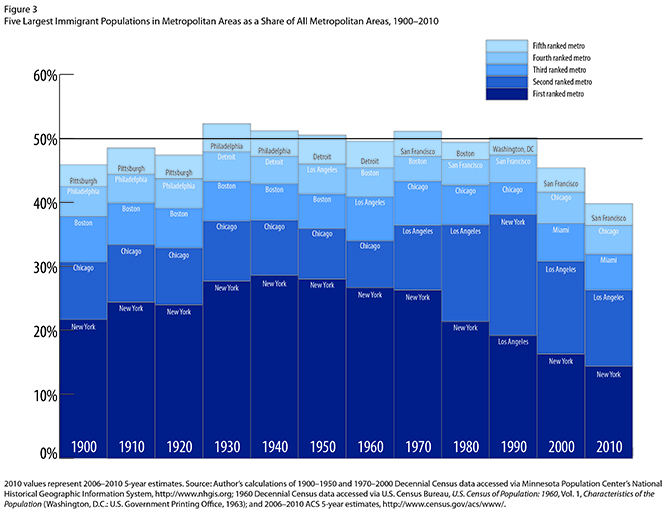 Historically, immigrants have been highly concentrated in a few places. Between 1930 and 1990, more than half of all immigrants lived in just five metropolitan areas. Since then, the share of these few destinations has declined, as immigrants have made their way to new metro areas, particularly in the South and West. During the same period, immigrants began to choose the suburbs over cities, following the decentralization of jobs and the movement of opportunities to suburban areas. There are now more immigrants in U.S. suburban areas than cities.