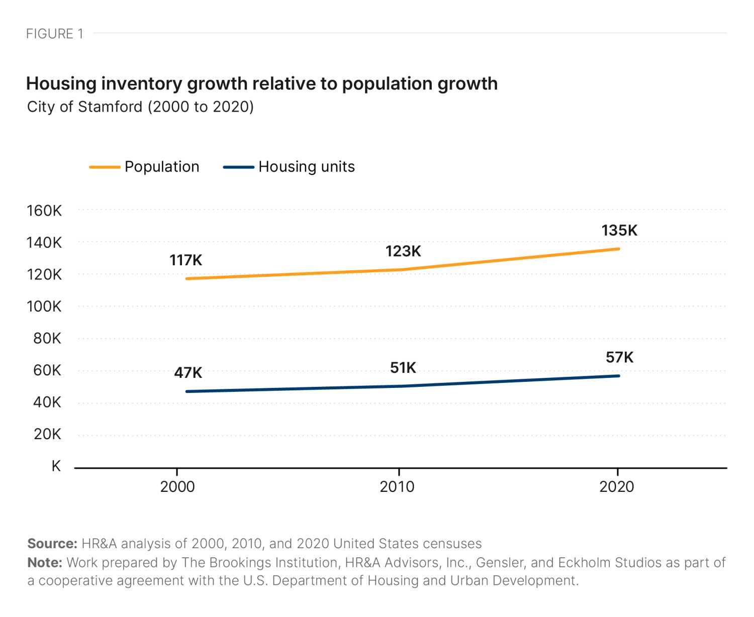 The residential population of Stamford remains relatively small, at approximately 136,000 people. However, residential demand has boomed in the last 20 years. Stamford grew by 18,000 residents between 2000 and 2020, with the majority of that growth occurring between 2010 and 2020 (Figure 1). This growth corresponds to 40% of the entire state’s population growth between 2010 and 2020. As the tri-state area regional housing shortage has grown more acute, Stamford is one of the only coastal Connecticut cities that has allowed for some new multifamily housing development, with the addition of 9,600 housing units since 2000.3