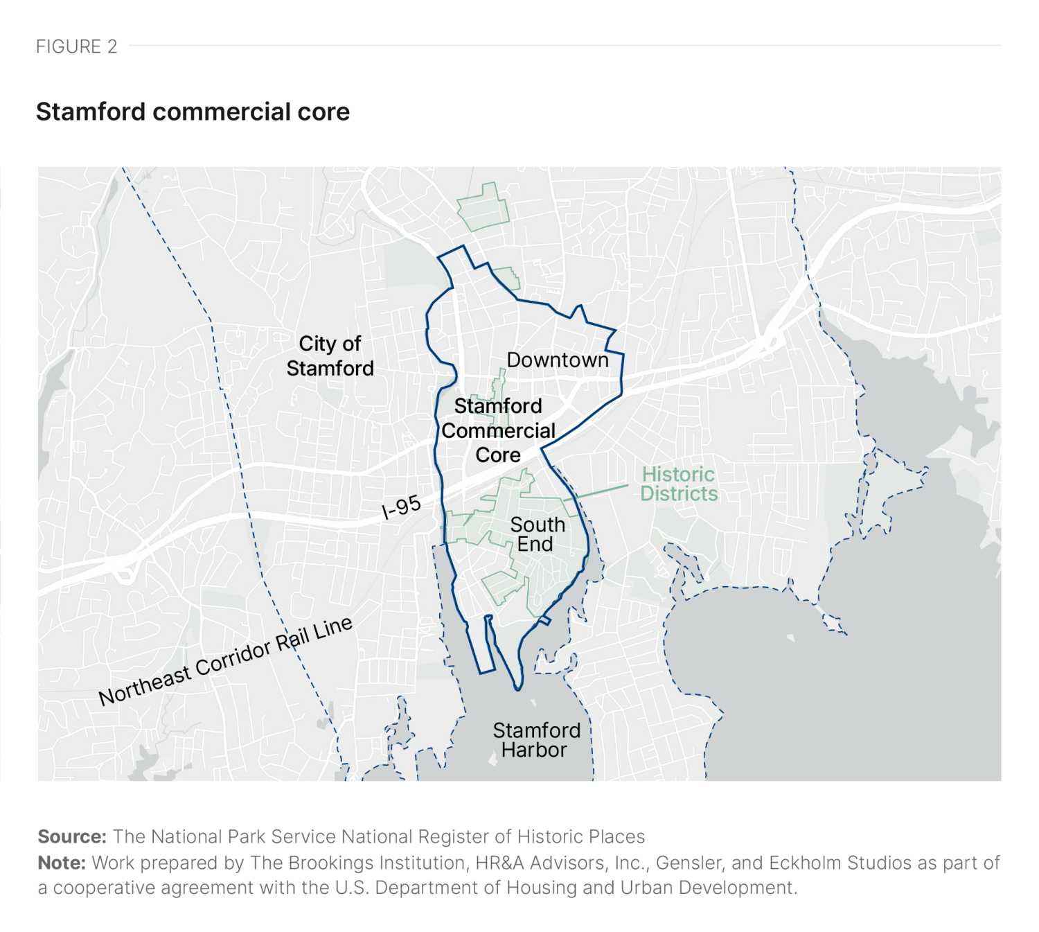 Where the full city boundary covers 37.6 square miles between the Long Island Sound and the Connecticut-New York border, the commercial core—the unit of analysis for our study—is a mixed-use, 1.3-square-mile region including the city’s downtown and burgeoning South End district (Figure 2). The commercial core is bisected by Interstate 95 and the Northeast Rail Corridor, which serves the central Stamford Transportation Center, a train station with Amtrak, Metro-North, and CTtransit service. Large and newer office buildings tend to have large floor plates and form a corridor along I-95, and smaller and older buildings are largely clustered in the northern section of the commercial core. Multifamily units are scattered throughout the commercial core, though there is a notable cluster in the South End near the waterfront, which has grown rapidly over the past two decades through major development projects such as Harbor Point.