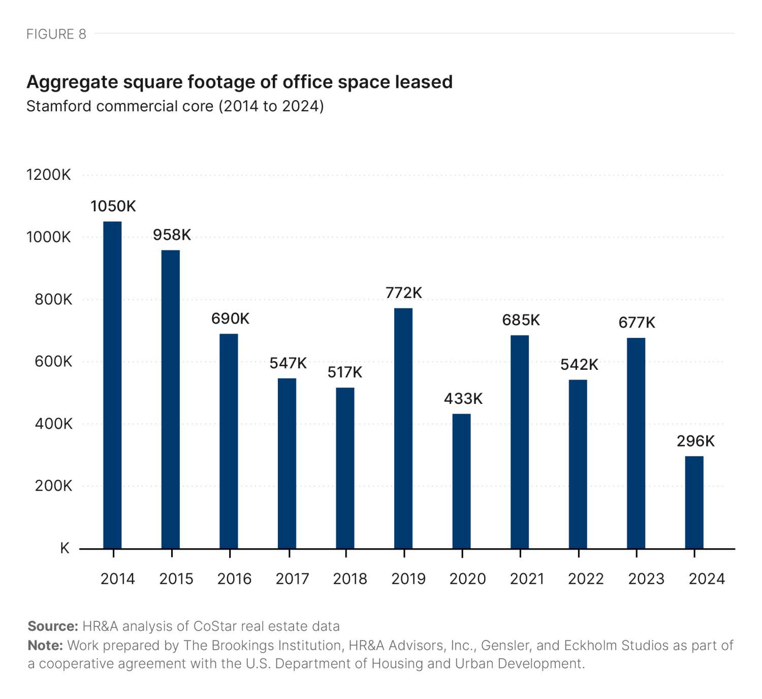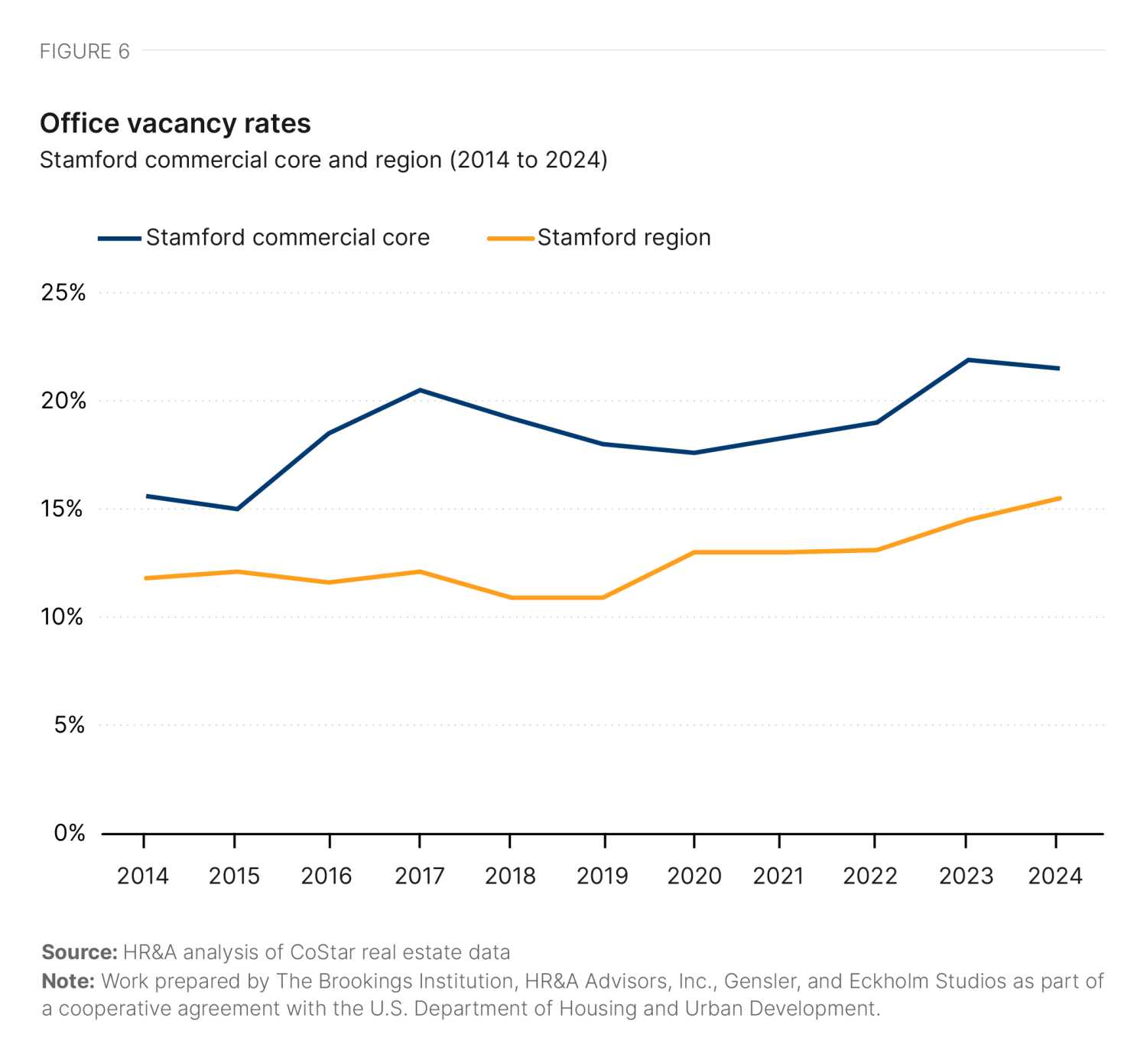 The office market in the Stamford commercial core has struggled for over a decade, while residential demand has boomed given chronic regional housing shortages. The pandemic exacerbated both trends, with offices experiencing additional vacancy (particularly in Class B and C buildings), while residential rent more than tripled.
